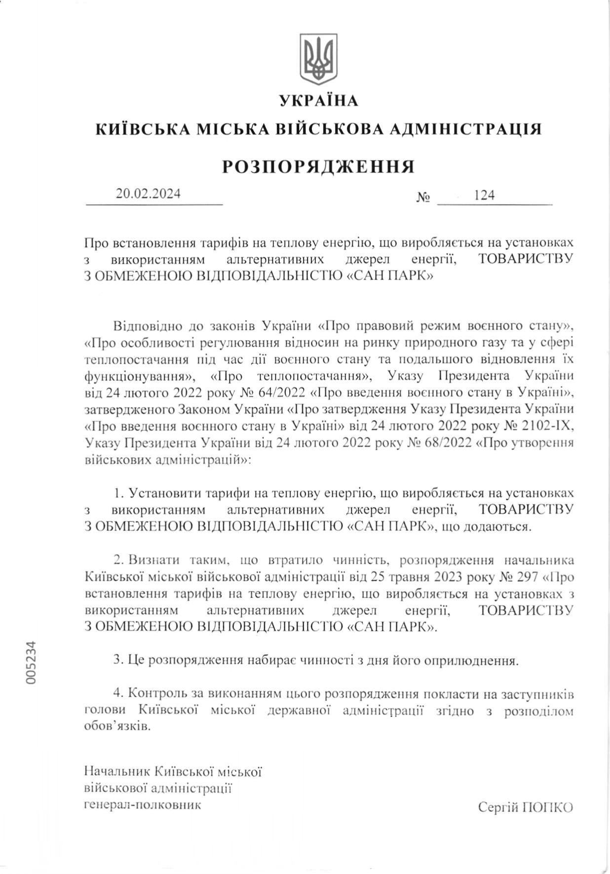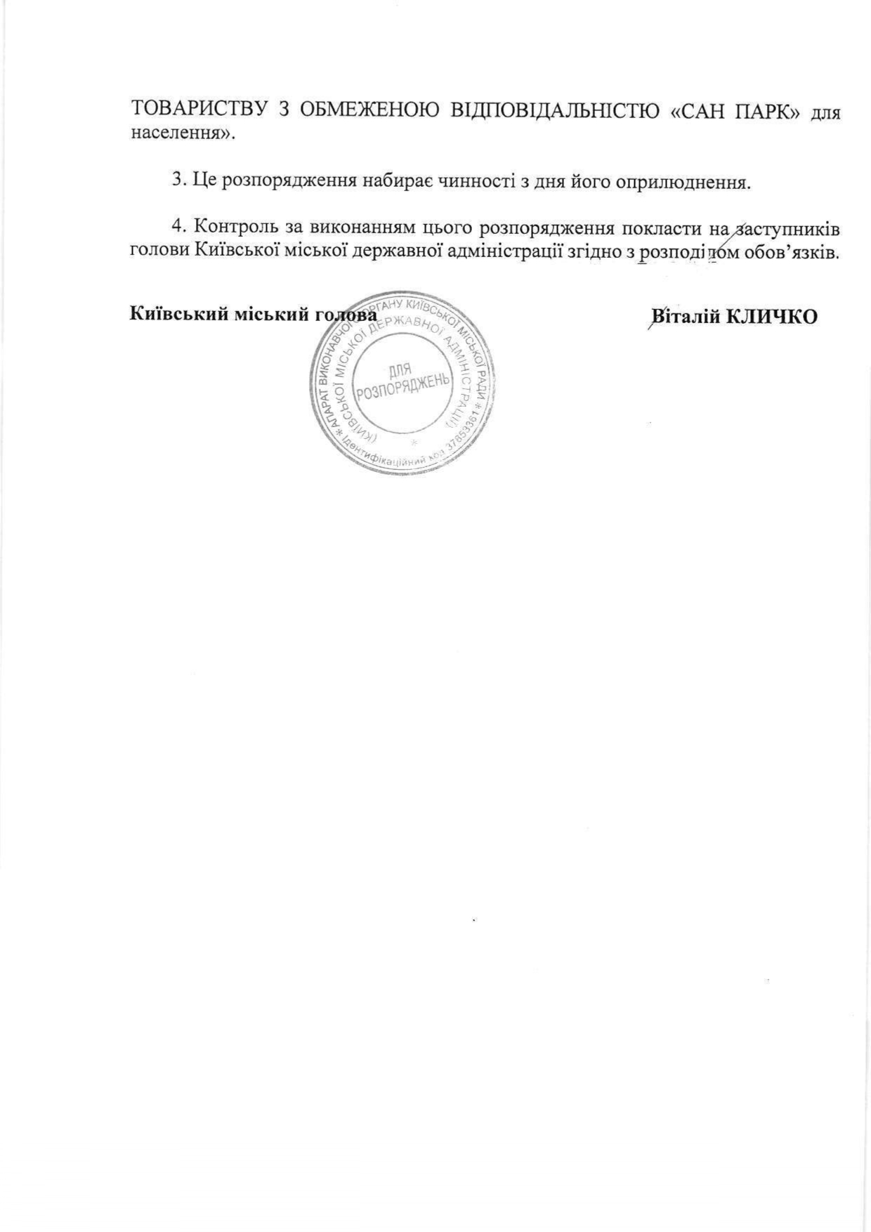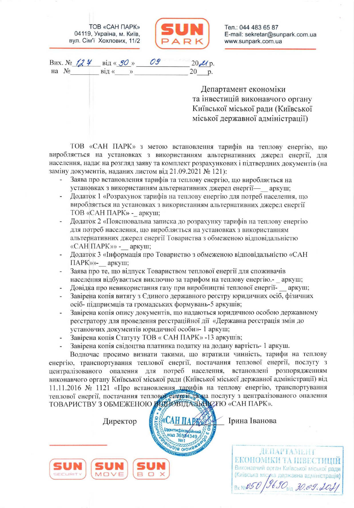 Розпорядженням виконавчого органу Київської міської ради (Київської міської державної адміністрації) від 11.11.2016 №1121 «Про встановлення тарифів на теплову енергію, транспортування теплової енергії, постачання теплової енергії та на послугу з централізованого опалення ТОВАРИСТВУ З ОБМЕЖЕНОЮ ВІДПОВІДАЛЬНІСТЮ «САН ПАРК» встановлені тарифи для населення та інших споживачів на: