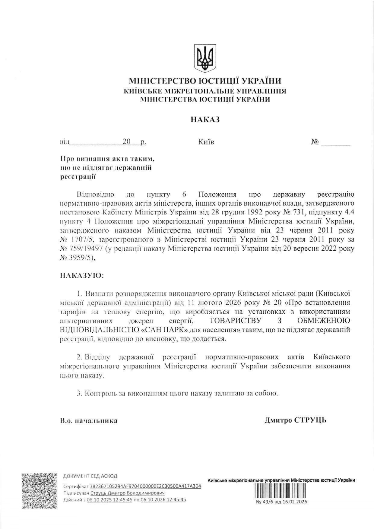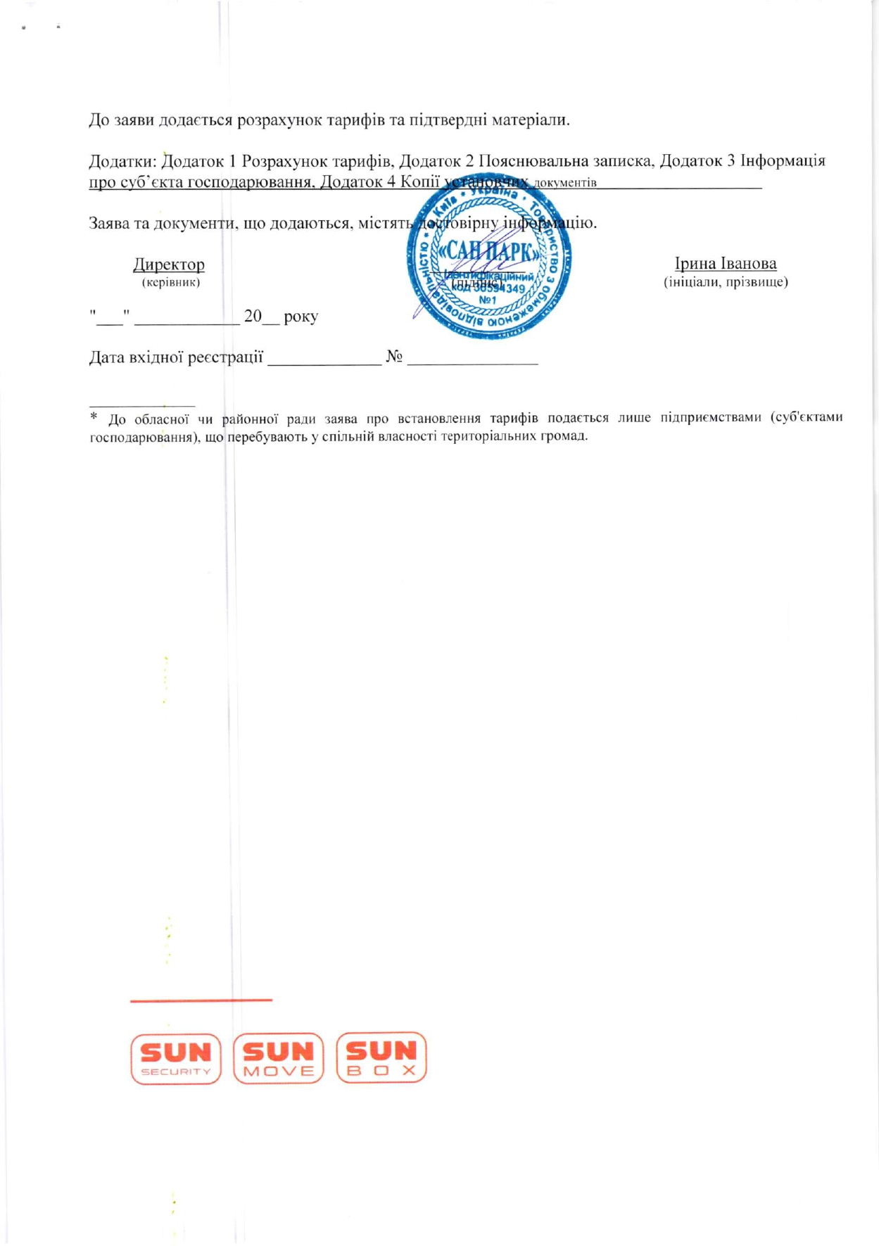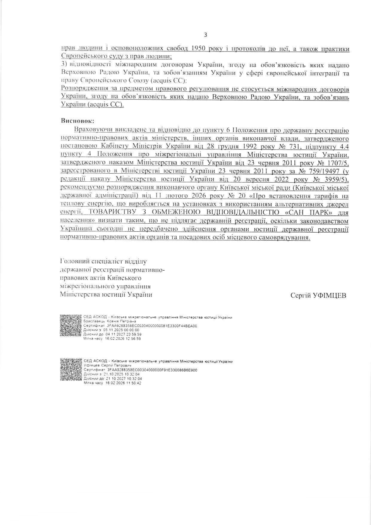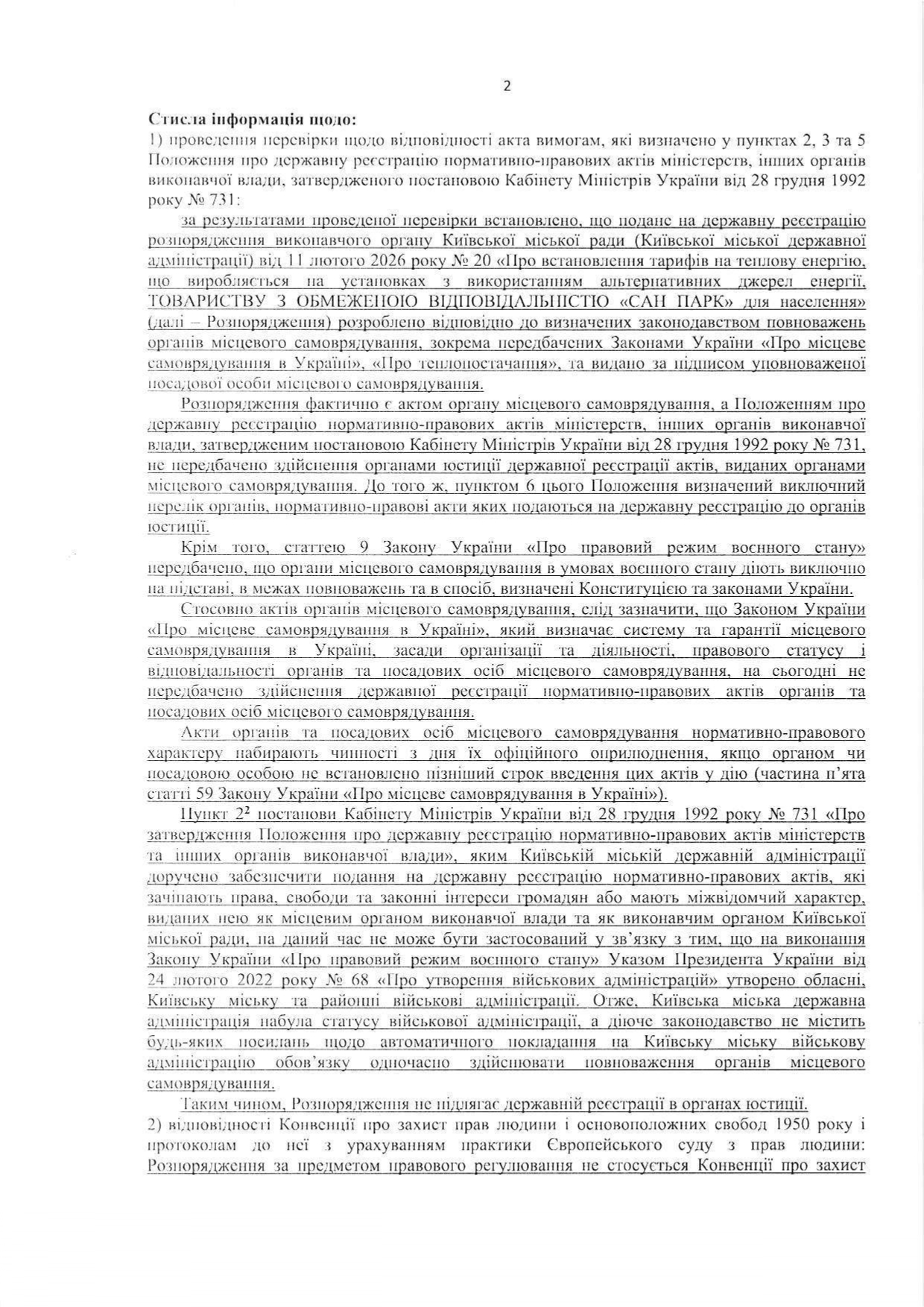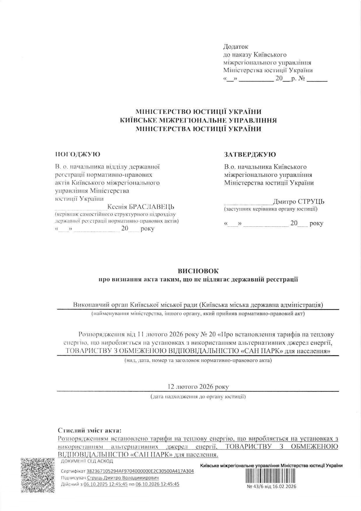 - теплову енергію ТОВ «САН ПАРК» (зареєстровано 24.11.2016р. в ГТУЮ у місті Києві за №241/1554):