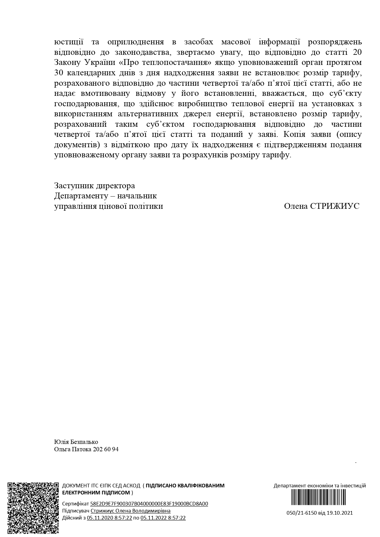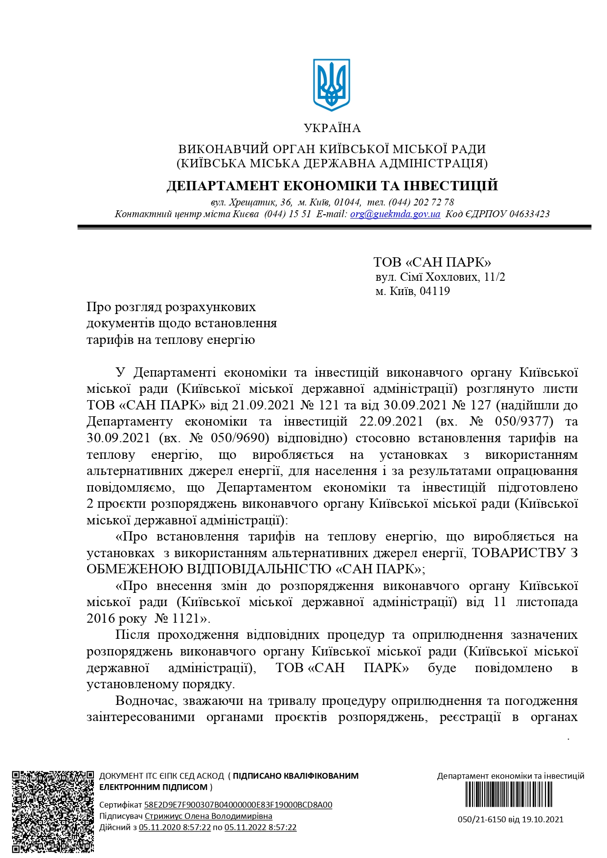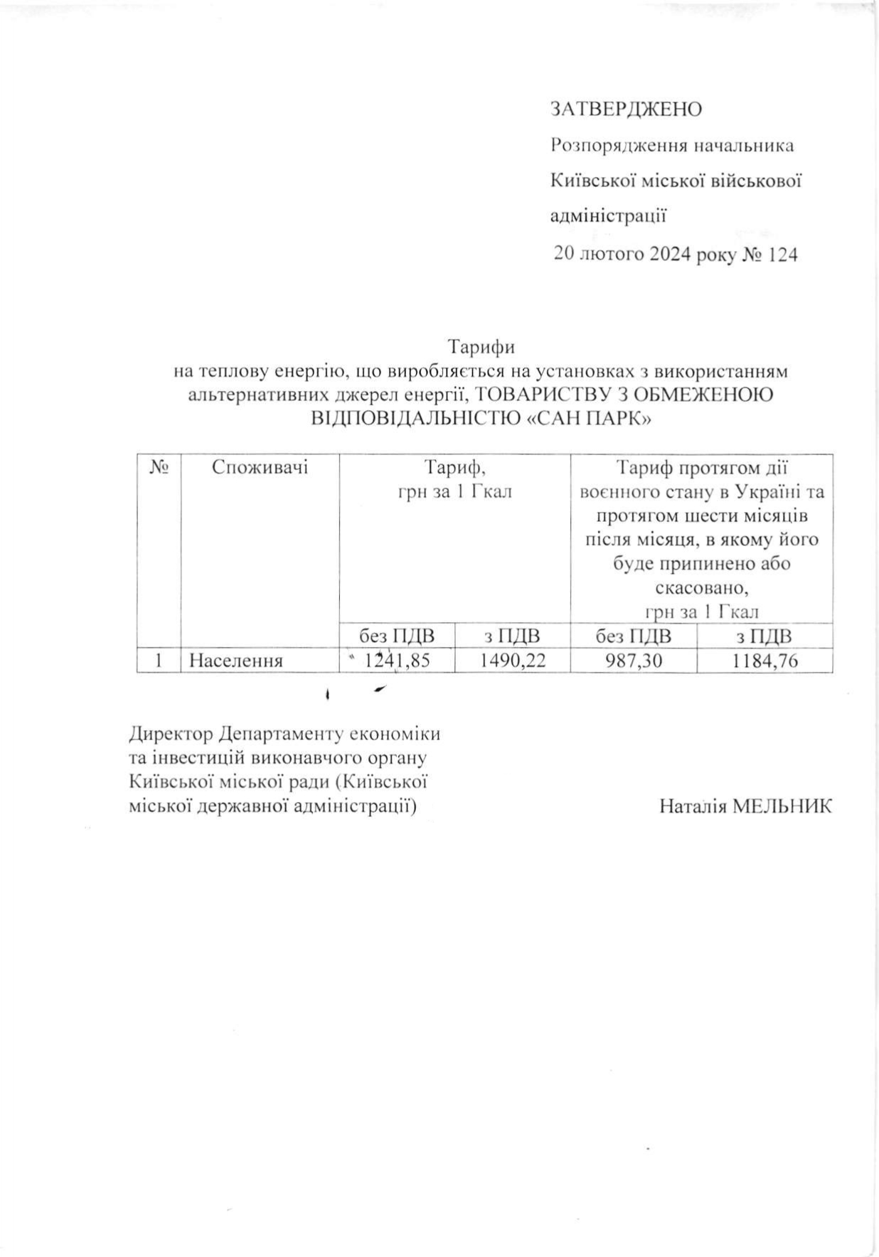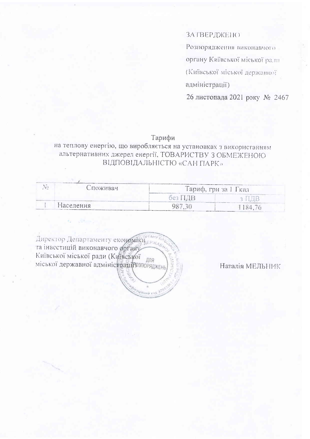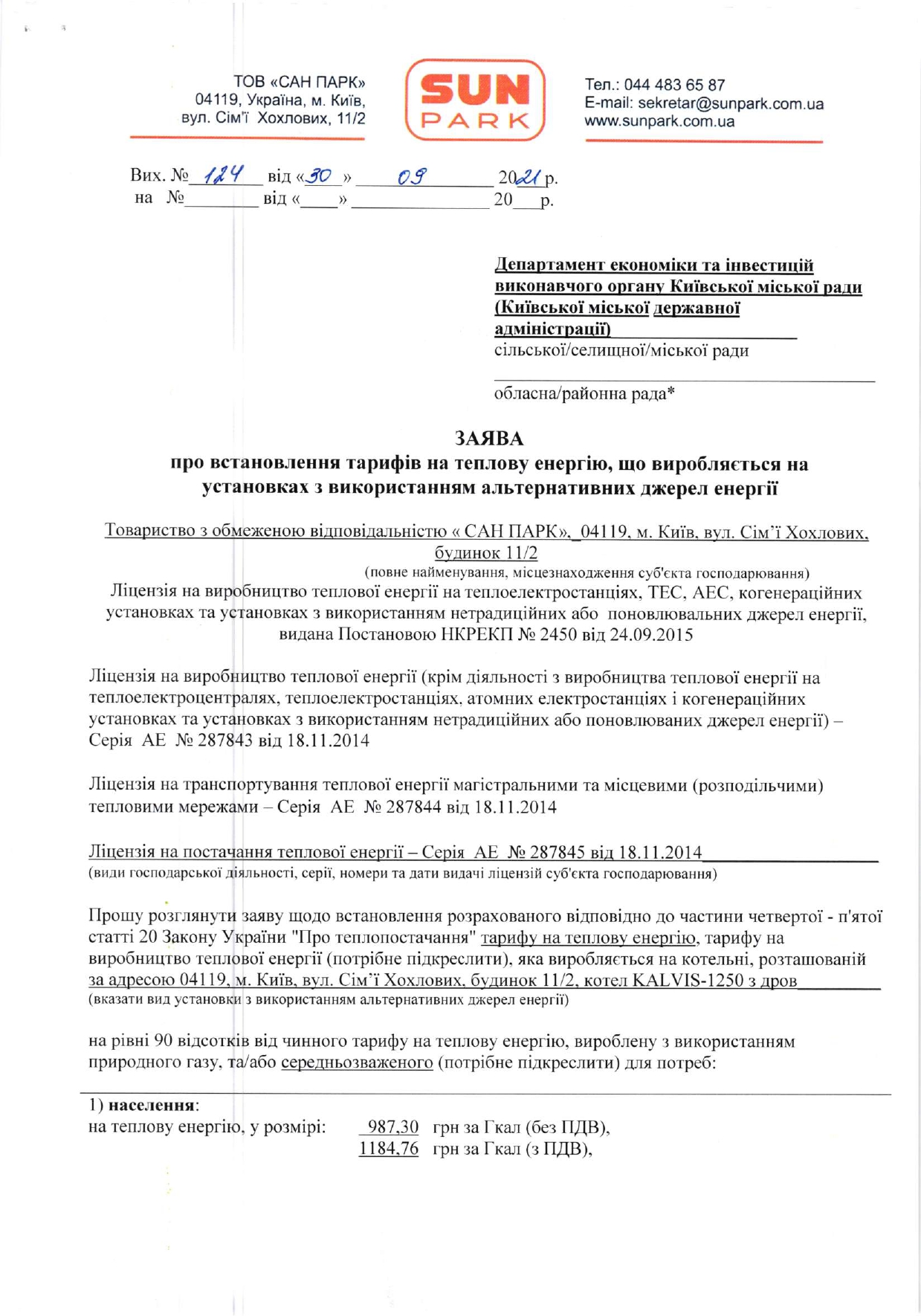 У відповідності до листа ДЕПАРТАМЕТУ ЕКОНОМІКИ ТА ІНВЕСТИЦІЙ № 050121-6150 ВІД 19 ЖОВТНЯ 2021 РОКУ «Про розгляд розрахункових документів щодо встановлення тарифів на теплову енергію» з 01 листопада 2021р .ТОВ «САН ПАРК» встановлено тариф для населення на теплову енергію, що виробляється на установках з використанням альтернативних джерел енергії у розмірі 1184,76 грн ( з ПДВ).